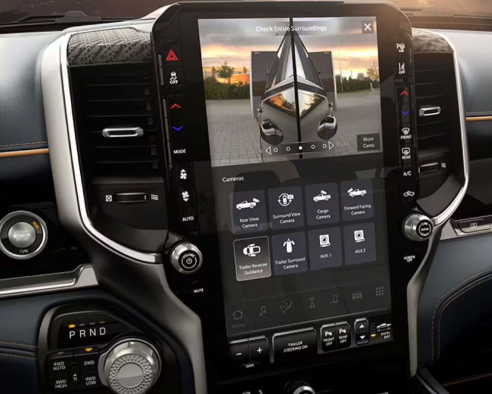 Continuing the legacy of innovation, the 2025 Ram 1500 Big Horn boasts an exceptional infotainment system featuring a highly responsive 12.0-inch touchscreen with the option to upgrade to a 14.5-inch touchscreen. Designed for seamless connectivity, both systems support Apple CarPlay and Android Auto, while the larger touchscreen offers redundant knobs and buttons for effortless control and accessibility.
